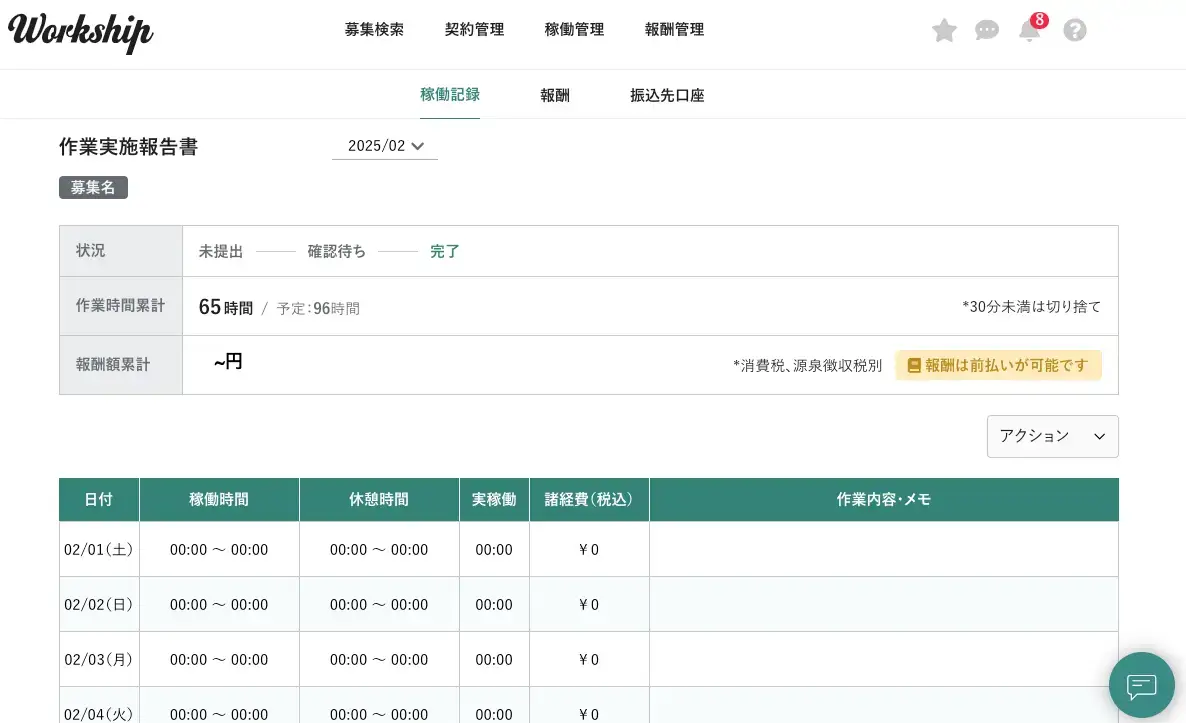 Workshipでは、候補者探しから契約、稼働報告の管理までを一つのサービス上で完結できます。稼働内容や時間を可視化できるため、「どの業務にどれくらい時間が使われているか」を把握しやすいです。またフリーランス側も、稼働時間や報酬を管理画面で閲覧できるため、双方にとって使いやすいサービスとなっています。