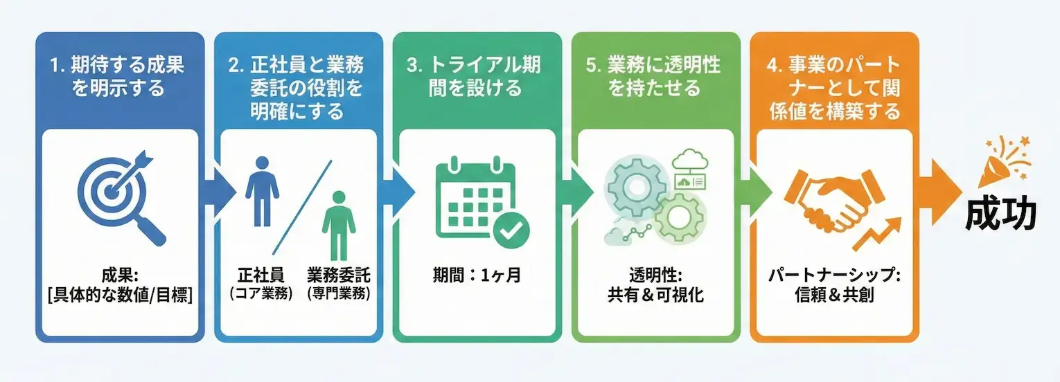 時給制の業務委託を成功させる5つのコツは、以下の画像の通りです。