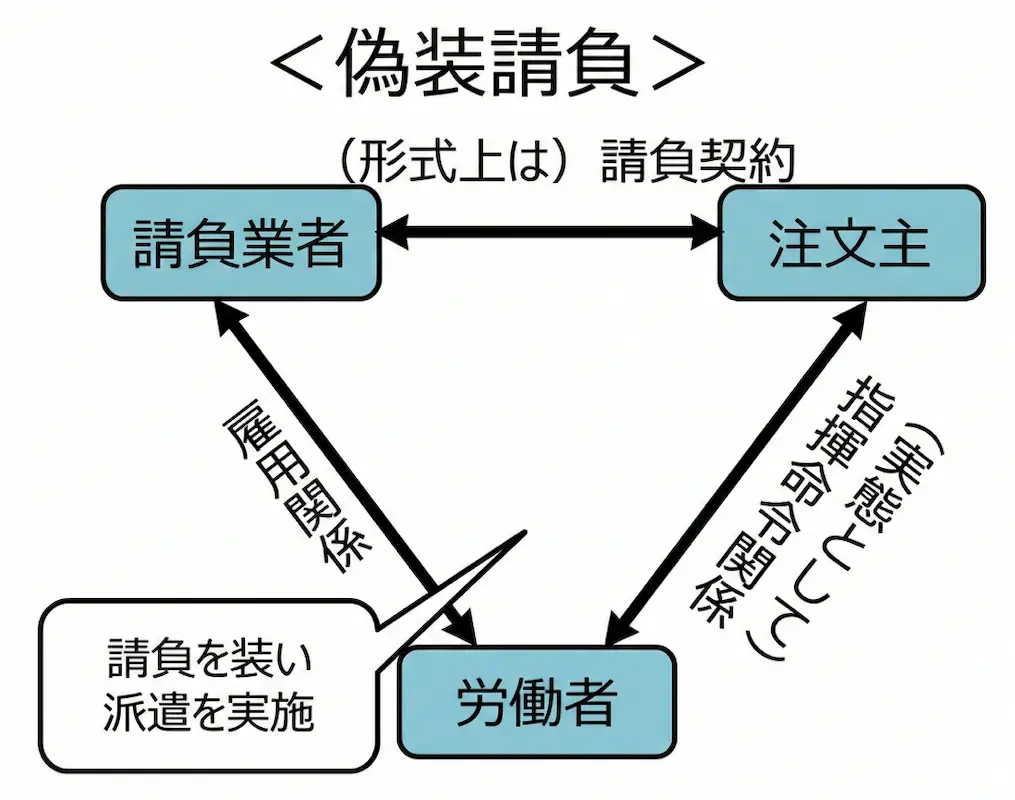 業務委託契約で最も注意すべき点が「偽装請負」です。偽装請負とは、契約上は業務委託にもかかわらず、実態として企業が業務の進め方や勤務時間などを直接指示し、雇用に近い働かせ方をしている状態・問題のことを指します。