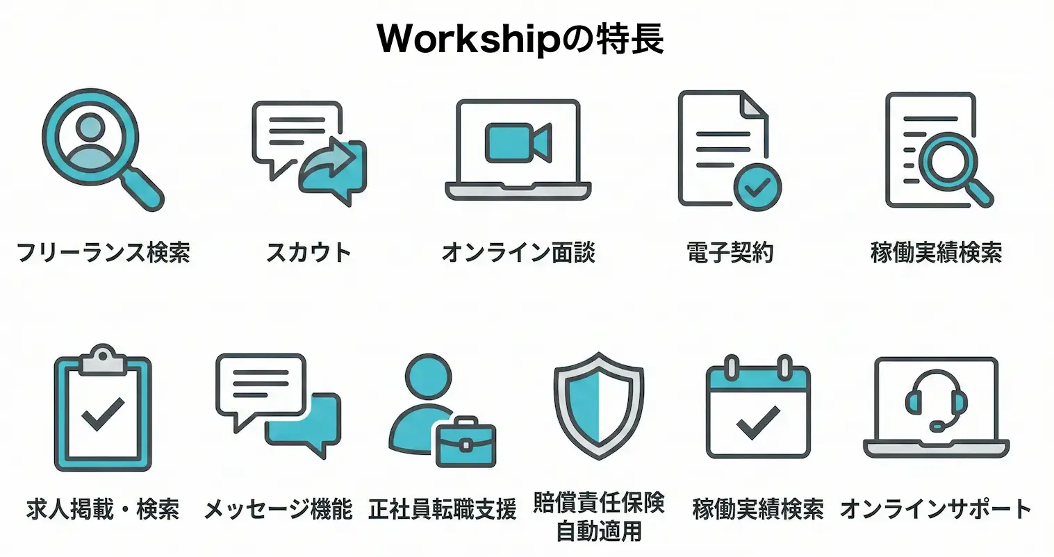 時給制で業務委託を進めたい場合、フリーランス・副業人材とのマッチングに特化したサービス『Workship(ワークシップ)』の活用がおすすめです。Workshipの特長は、以下の通りです。