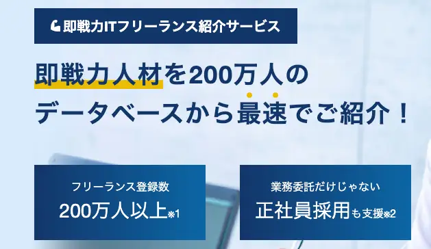 早く自分の希望条件に合う案件・求人の紹介を受けたいフリーランスのITエンジニアやWEBデザイナーにおすすめのエージェントサービスです。