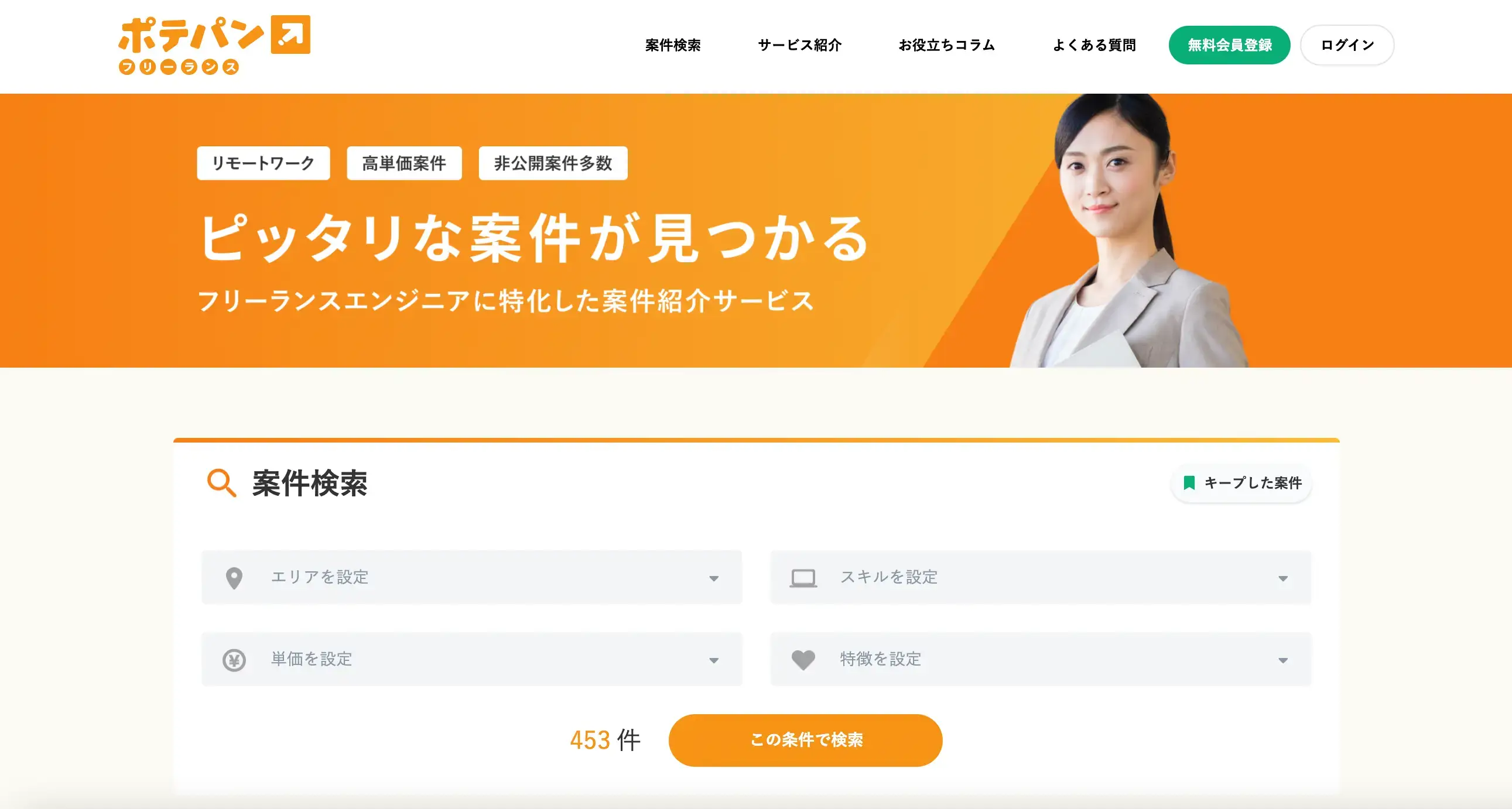 ポテパンフリーランスはプログラミングスクール「ポテパンキャンプ」を運営する株式会社ポテパンが運営するフリーランス専門エージェントです。プログラミングスクールを傘下にもつエージェントだからこそ、フリーランスへの対応が厚く採用企業側の心配事が少ない点がメリットです。