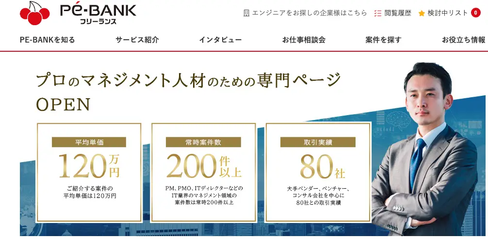 PE-BANKは運営実績30年以上の老舗エージェントで、8~15%程度という低マージンが特徴です。全国主要都市で案件紹介が可能で、地方在住のフリーランスにも強い味方となっています。長期安定的に安定した人材供給を期待する企業におすすめのサービスです。