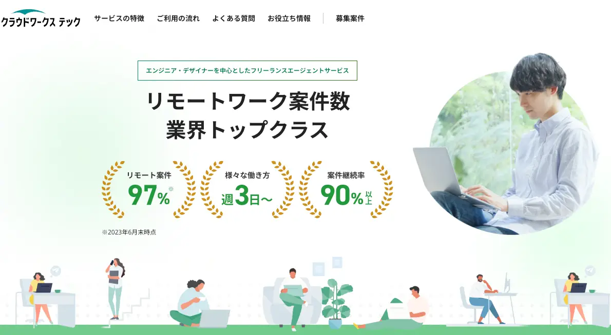クラウドワークステックは「クラウドワークス」運営のエージェントサービスで、リモートや時短案件が豊富です。登録から案件紹介、契約・報酬まで一貫サポートしており、初めて利用する方も安心できる体制が整っています。