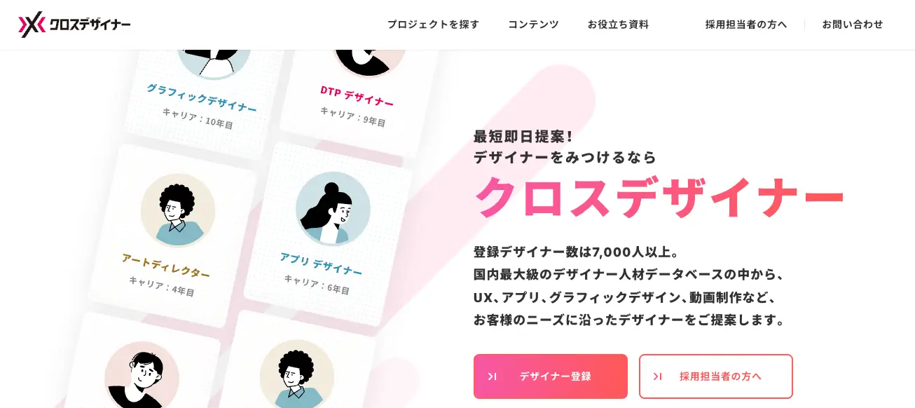クロスデザイナーは、7,000人以上の登録者を持つ国内最大級のフリーランスデザイナー専門のエージェントです。