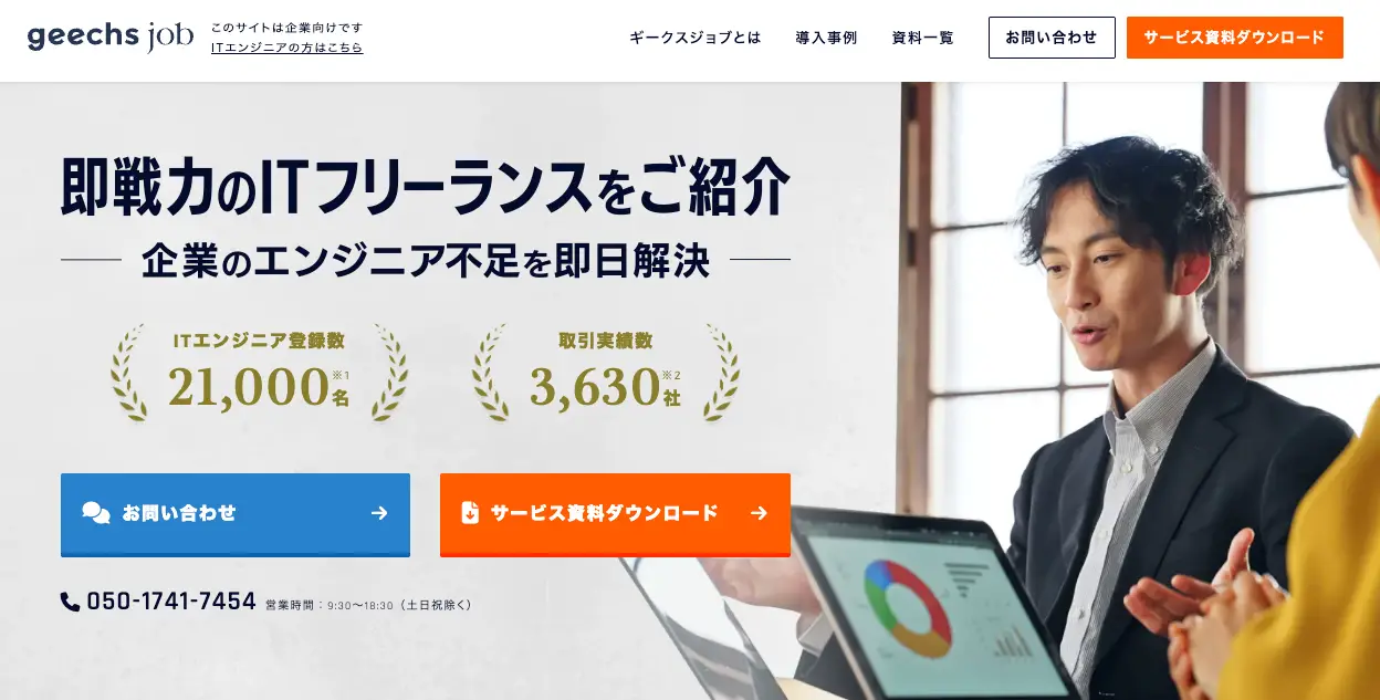 ギークスジョブはITエンジニア向けに豊富な案件を提供し、サポート体制も手厚いエージェントです。キャリアカウンセリングや福利厚生、コミュニティ運営など、フリーランスの成長を多角的に支援しており、中長期的なプロジェクトを外注したい企業におすすめのサービスです。
