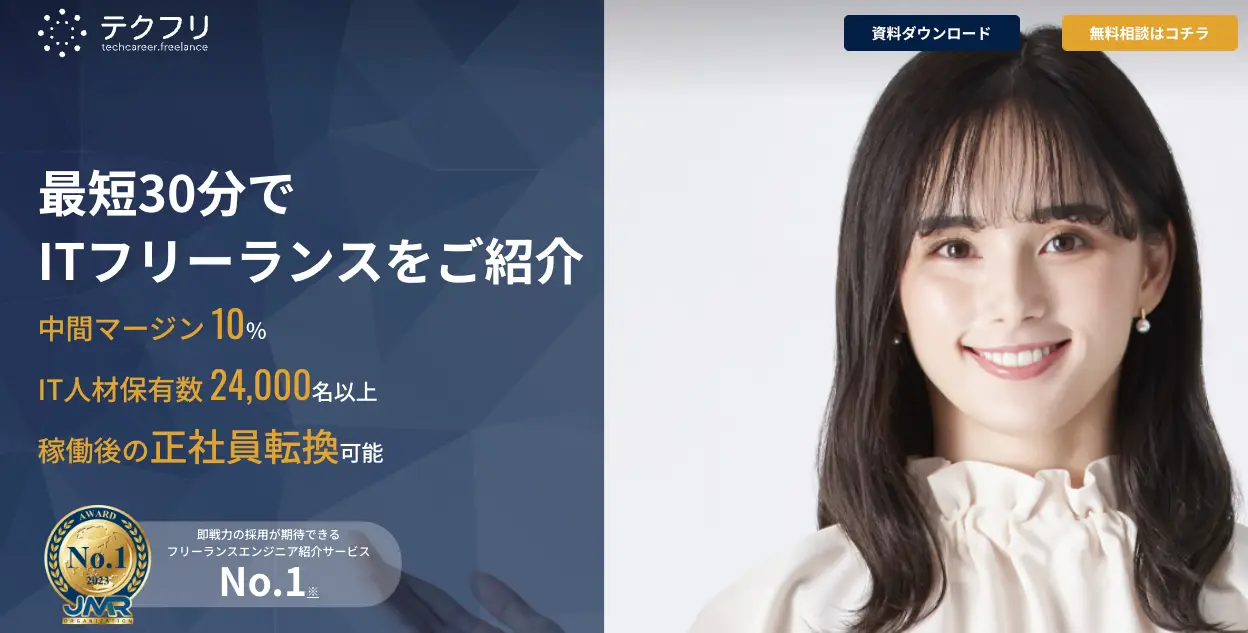 テクフリはエンジニア・クリエイター向けの高単価案件やリモート案件が豊富なエージェントです。スキルや希望条件に合わせたマッチング精度が高く、スピーディーな人材紹介とサポートが強みです。