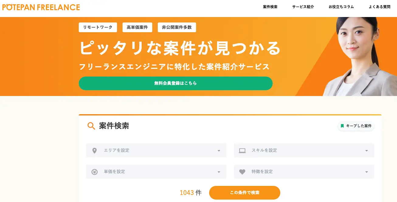 ポテパンフリーランスはIT・Web系エンジニアの採用向けのサービスで、特に若手や実務経験が少ない方にもアプローチが可能です。