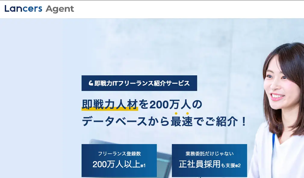 ランサーズエージェントは大手クラウドソーシング「ランサーズ」が運営するエージェントサービスです。多様な職種・業界の案件が揃い、マッチングから契約、報酬支払いまで一元管理できるのが強みで、幅広い人材層にアクセス可能です。