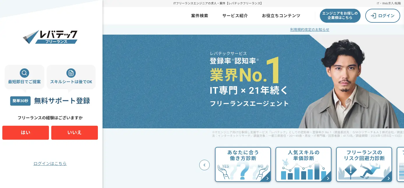 レバテックフリーランスは、業界最大級の案件数と認知度を誇るサービスのひとつです。