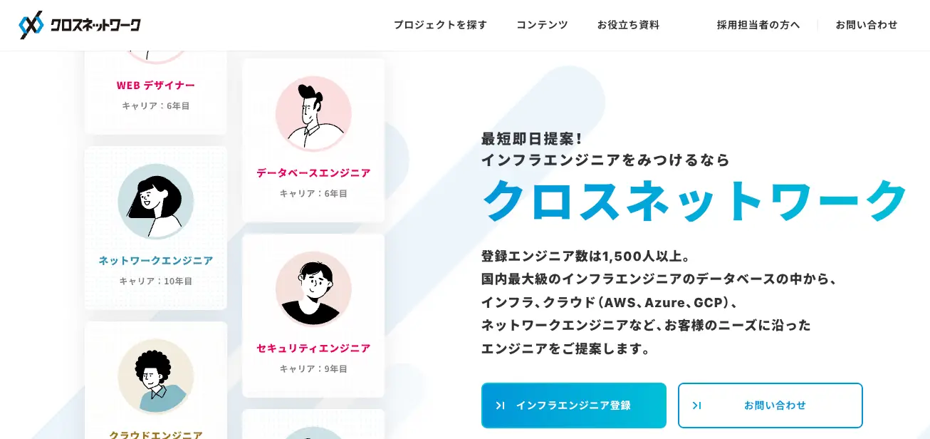 クロスネットワークは、1,500人以上のインフラエンジニアが登録する専門エージェントです。