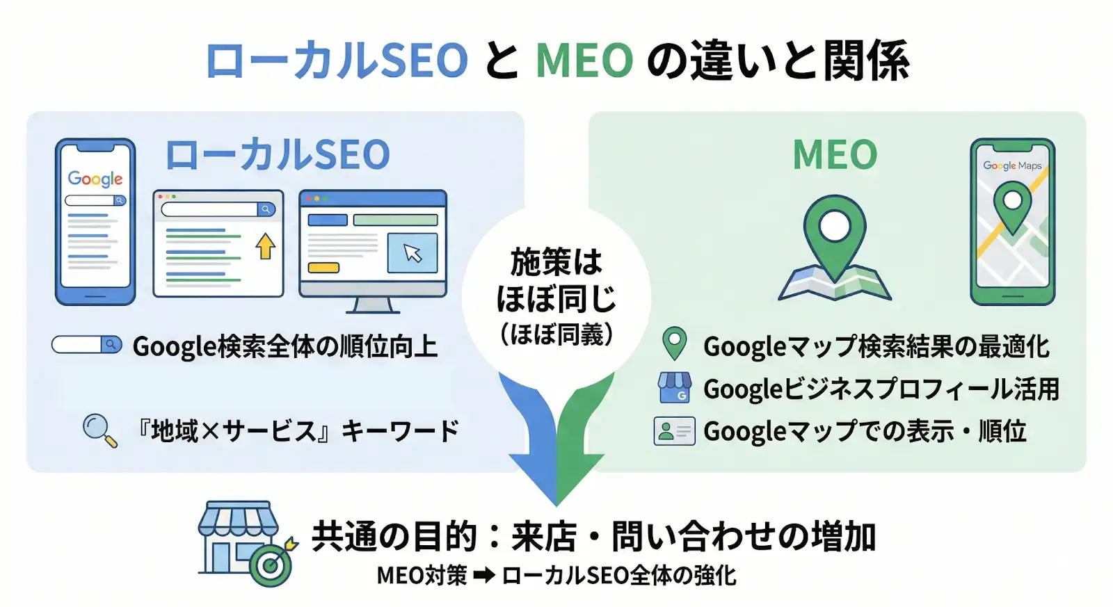 またMEOとは、主にGoogleマップでの検索結果を最適化する取り組みのこと。実際の施策はローカルSEOとほぼ同じであり、同義として使われています。 そのため、「MEO対策をしている」ということは、結果的に「ローカルSEO全体を強化している」ということになります。