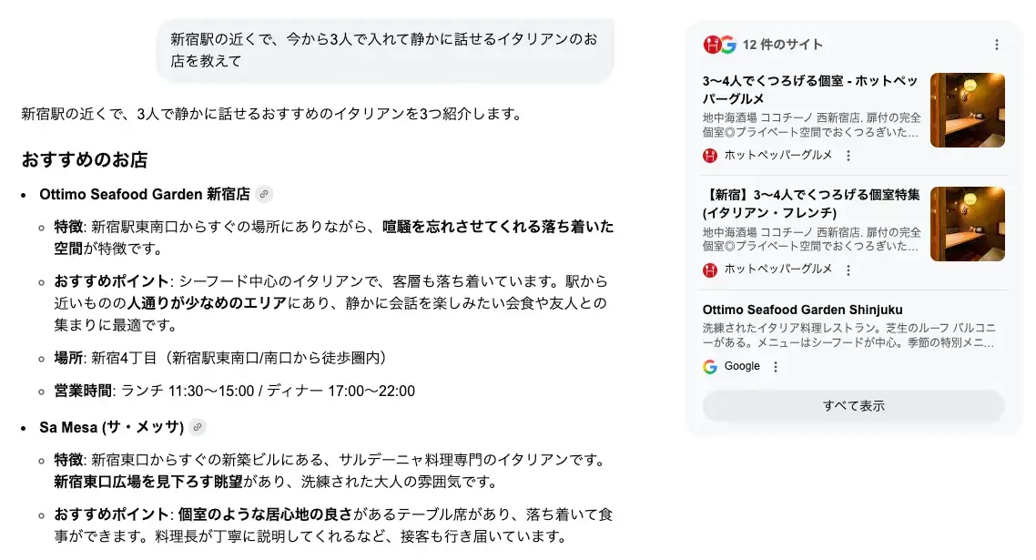 たとえば、GoogleのAIモードで「新宿駅の近くで、今から3人で入れて静かに話せるイタリアンのお店を教えて」といったように、条件を具体的に伝える会話型の検索が増えています。