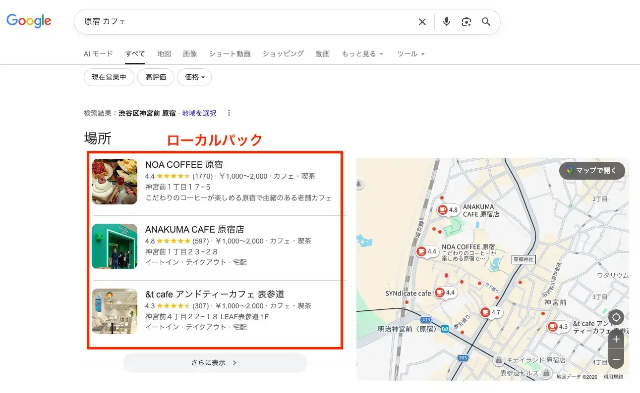Google検索やGoogleマップで、地域に関連する検索を行うと、検索結果の最上部に「ローカルパック(地図と店舗情報が3件表示される枠)」が表示されます。ローカルパックは、Webサイトの検索結果よりも目立つ位置に配置されるため、Webサイトよりも先にクリックされる可能性が高いです。