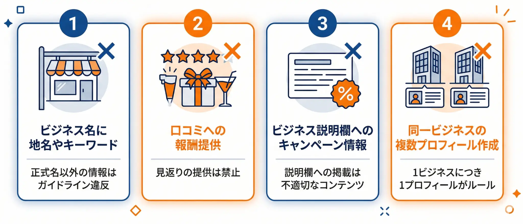 プロフィールが停止されると、検索結果に表示されなくなり、ビジネス情報の編集もできなくなります。 積み上げてきた口コミや評価がすべて見えなくなるため、集客においてもマイナスです。特に注意したいNG行為は以下の通り。