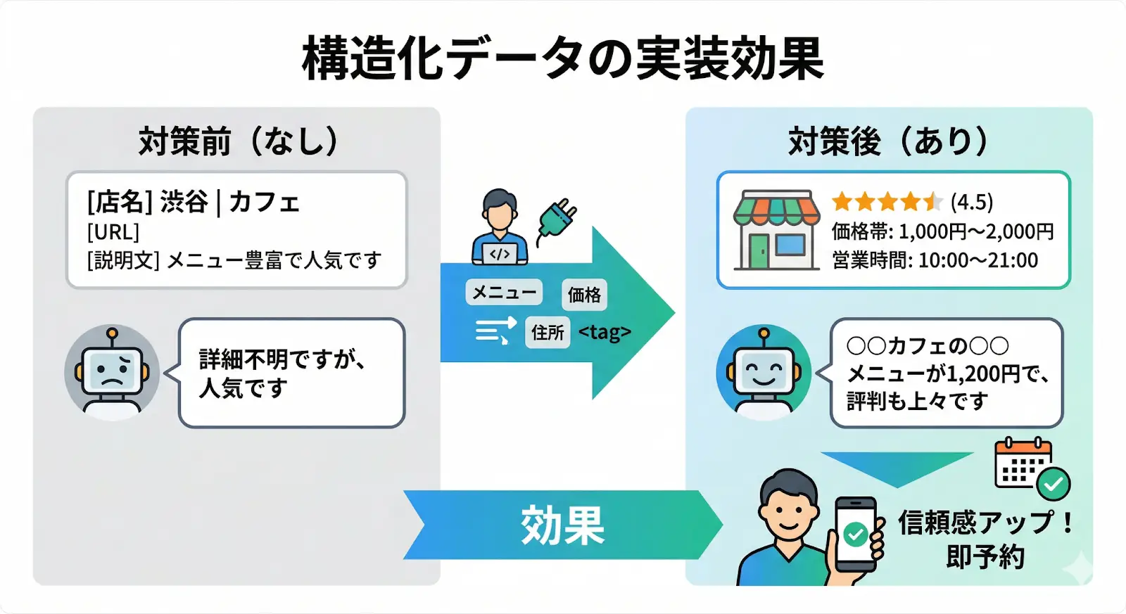 構造化データとは、検索エンジンやAIがWebサイトの情報を正確に読み取れるよう、決められた形式(コード)で記述することです。整備の有無で、以下のように変わります。