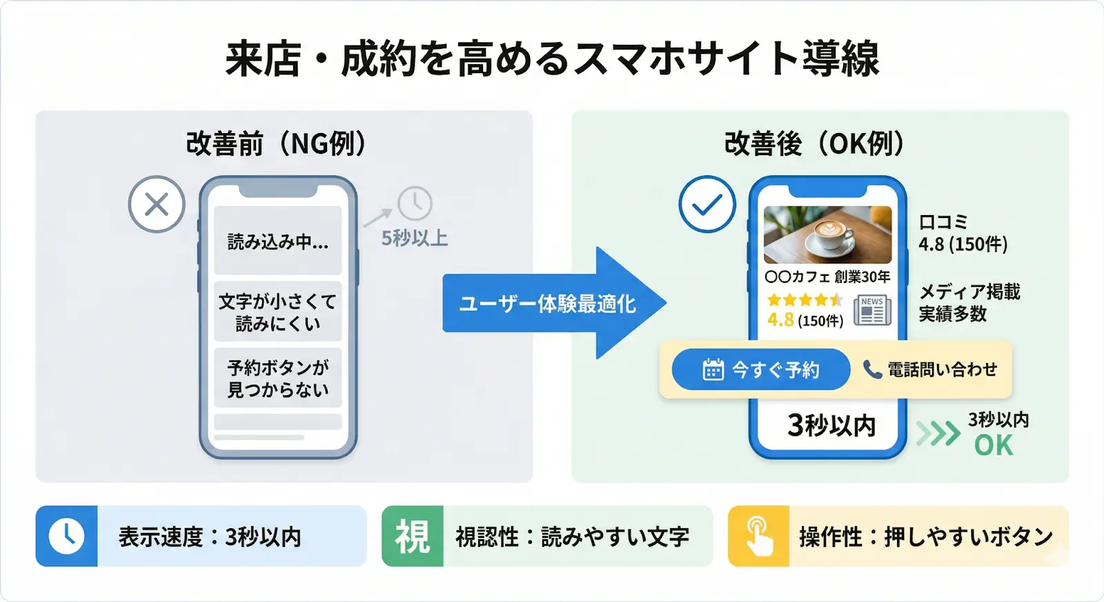 たとえば、「サイトが重い」「文字が小さい」「ボタンが押しにくい」だけで、ユーザーは数秒で離脱します。Googleビジネスプロフィールからのアクセスはほぼスマホ経由のため、スマートフォンでの表示速度と視認性の改善が最優先です。