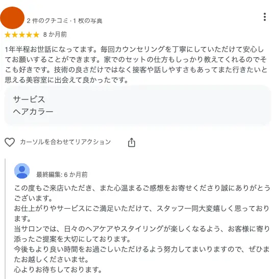 たとえば、「〇〇(地域名)で一番美味しい」「〇〇(サービス名)が丁寧だった」など、狙うキーワードが自然に含まれる口コミは、ローカル検索での評価にも好影響を与えます。来店後の満足度が高いタイミングで、口コミ投稿をさりげなく促しましょう。