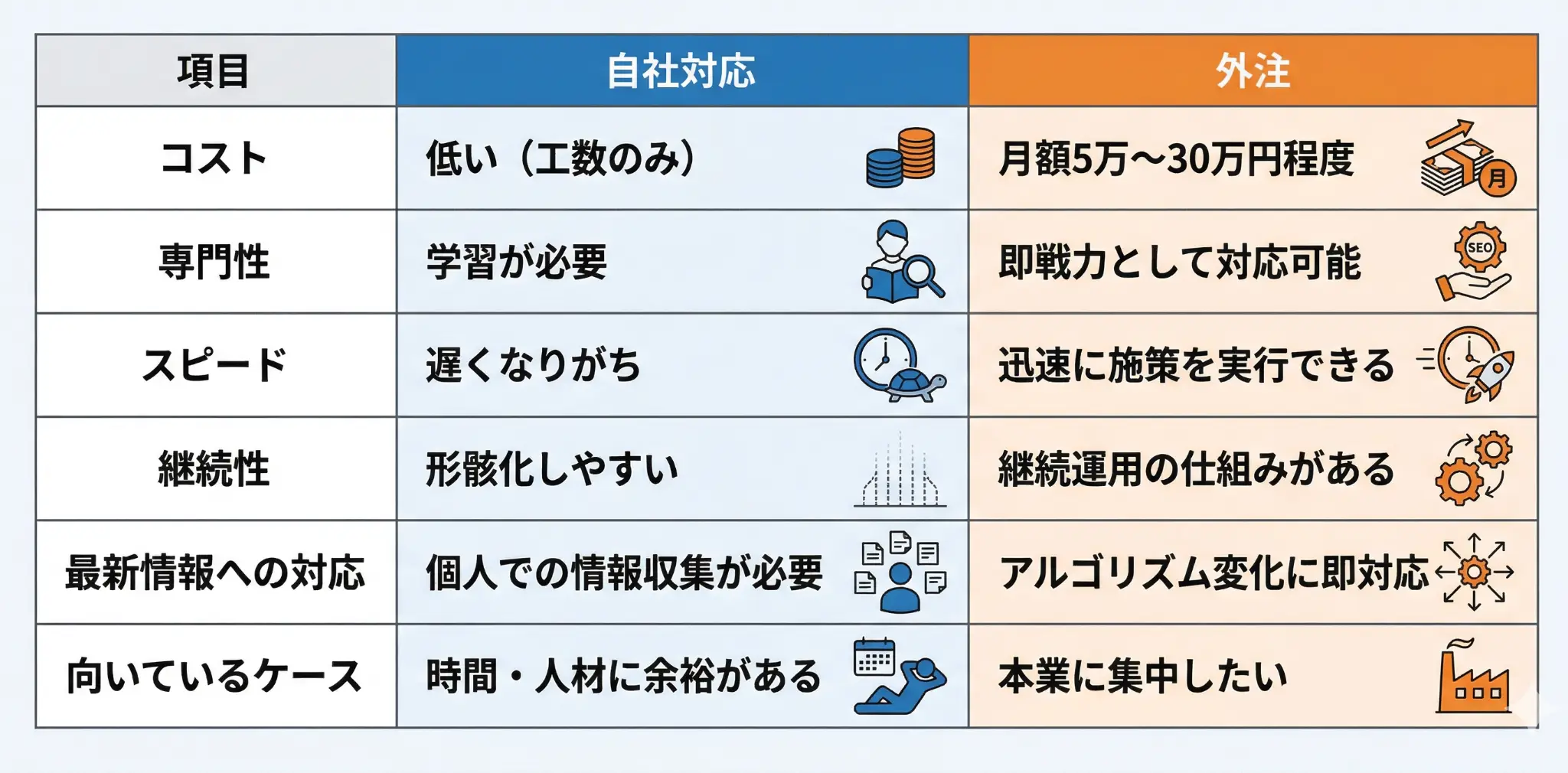 まずは自社・外注それぞれの特徴を整理した上で、判断の目安を確認しましょう。以下の表では、自社対応と外注を比較しました。