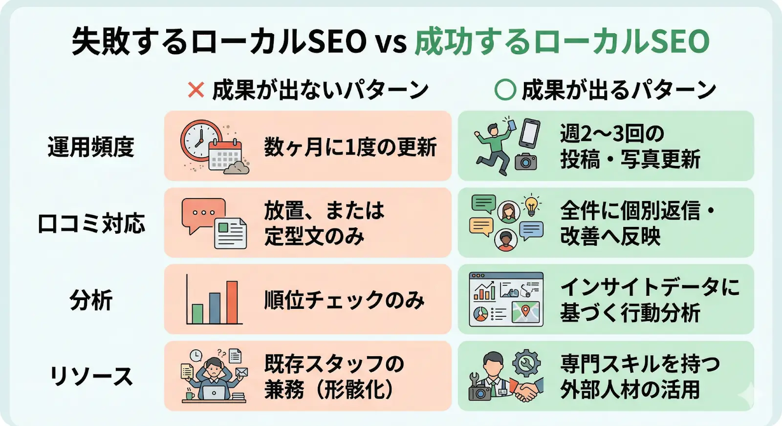 ローカルSEOに取り組んでいるのに「成果が出ない」という声は少なくありません。その多くは、施策の内容ではなく、運用の質と継続性に原因があります。成果が出るビジネスと出ないビジネスには、以下のような差があります。