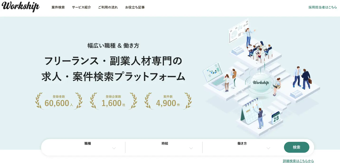 Workshipは、IT分野を中心に6万人以上のフリーランス・副業人材が登録するプラットフォームです。
